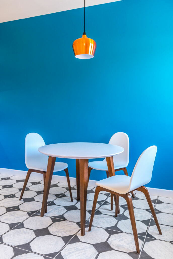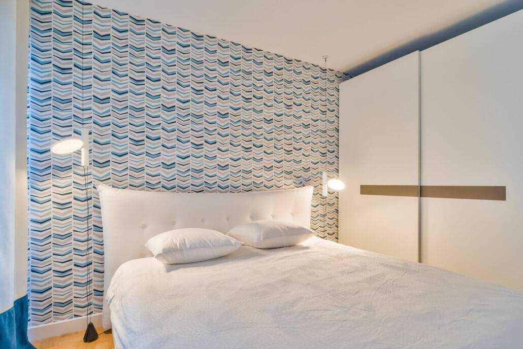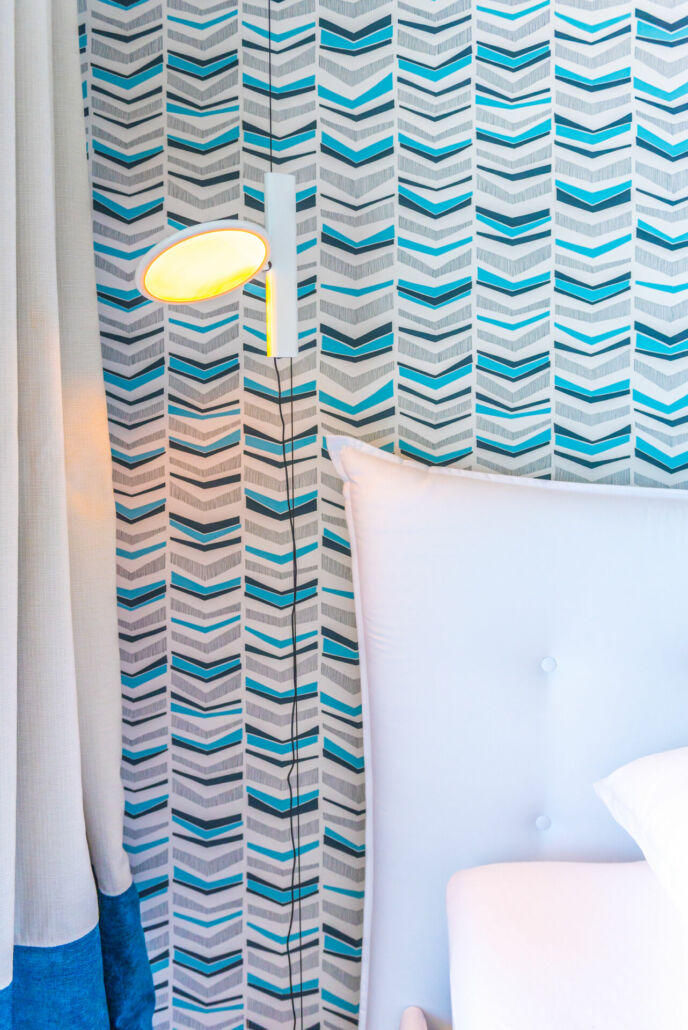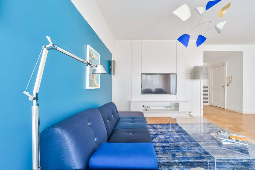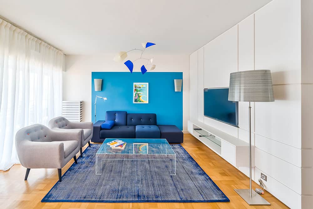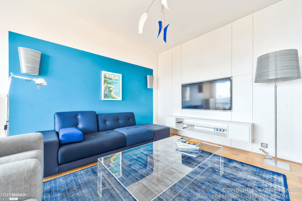 Le fil conducteur de cet appartement est la couleur bleue , référence à la mer et déclinée en peinture, papier peint, mobilier…. jusqu’au très poétique mobile numéroté suspendu dans le salon crée par un designer spécifiquement pour l’appartement.