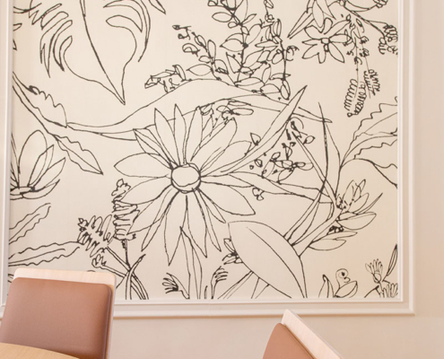 Le traitement des murs n’a pas été oublié par l’ajout de la couleur bleue apaisante et le choix de papier peints d’inspiration végétale.